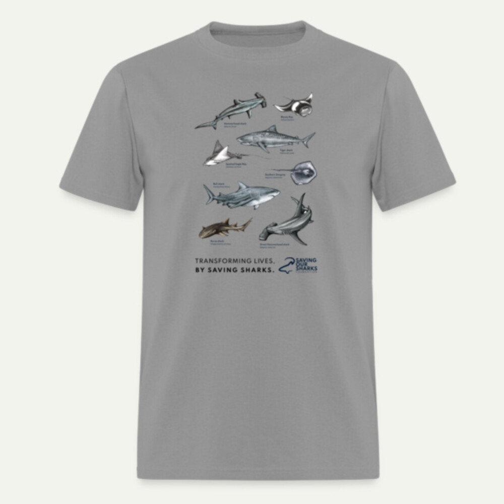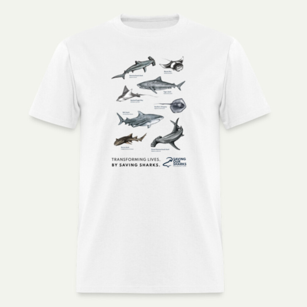 Join the movement and make a difference for shark conservation with our Sharks & Rays T-shirt, featuring the 8 species of sharks and rays we protect in the Mexican Caribbean. Made from 100% cotton, it's perfect for a stylish look that supports a cause.