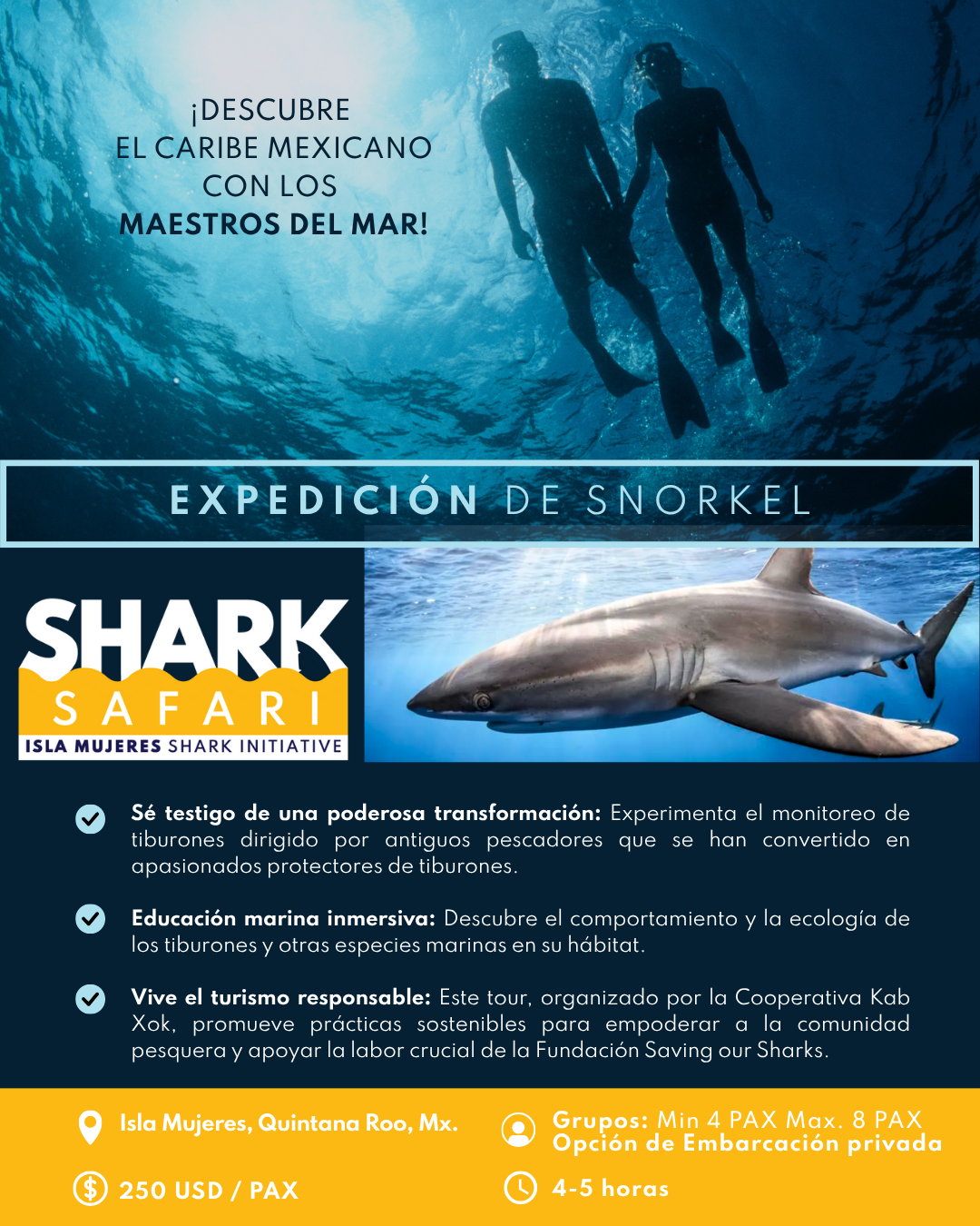 The expedition is fully organized and guided by the Kab Xok Cooperative And it has the support of marine biologists from the Saving Our Sharks Foundation. Each expedition is part citizen science, part cultural travel, and part conservation action. You'll sail through the crystal-clear waters of the Caribbean alongside majestic sharks, learning about their behavior, their importance to the health of the ocean, and the threats they face. You'll also have the exceptional opportunity to snorkel with them for a few unforgettable minutes: a life-changing experience that will deeply connect you with nature.